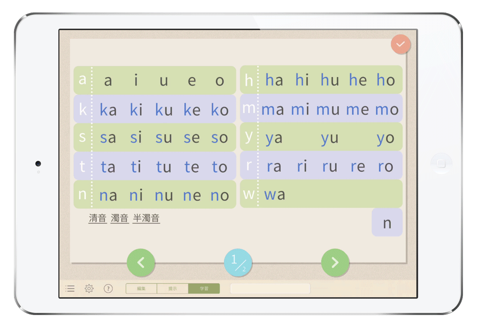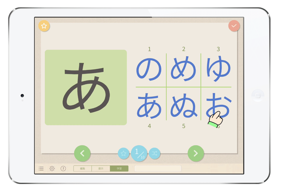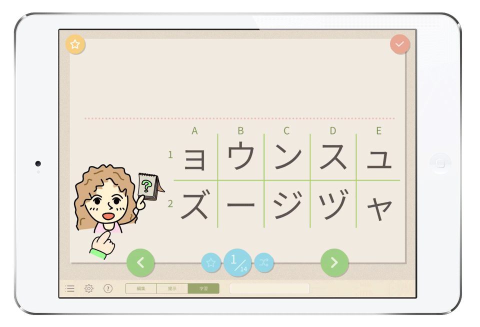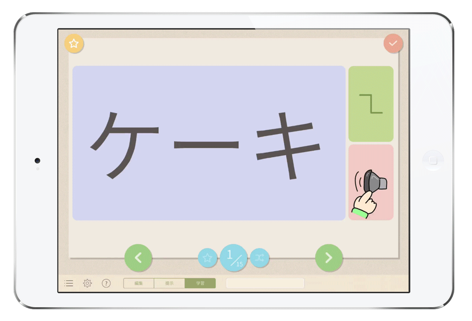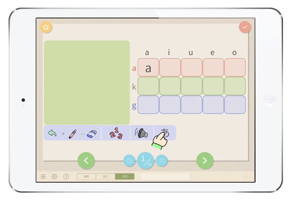 文字をドラッグして単語を作ったり、文字に触れて音声を聞き発音方法をアニメーションで確認したり...。簡単操作で楽しく日本語の音声と文字を教えられる教材です。